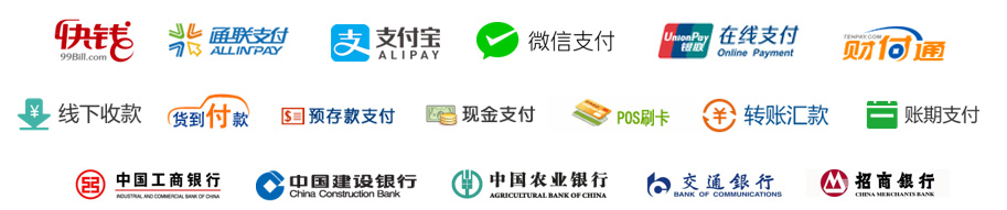 集成支付宝、微信支付、扫码支付、银联在线、通联在线、快钱、招商银行、工商银行、农业银行、中国银行、建设银行